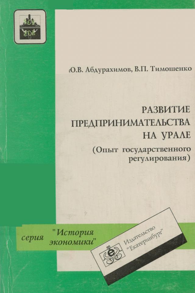 Абдурахимов Ю. В. Развитие предпринимательства на Урале. (Опыт государственного регулирования) / Ю. В. Абдурахимов, В. П. Тимошенко ; ответственный редактор В. В. Алексеев ; Российская академия наук, Уральское отделение, Институт истории и археологии. - Екатеринбург : Екатеринбург, 1996. - 132 с. - (Серия "История экономики").