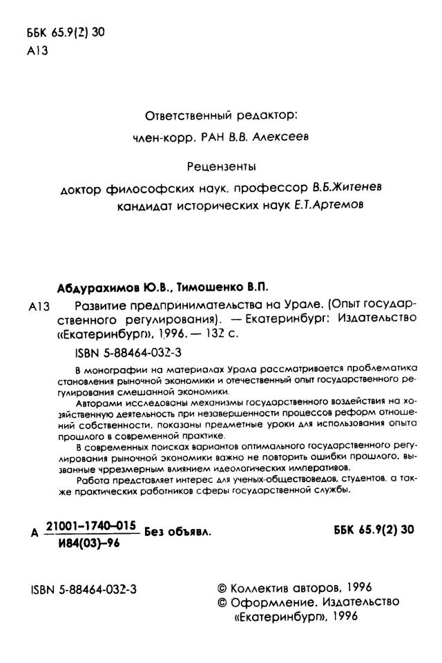 Абдурахимов Ю. В. Развитие предпринимательства на Урале : (опыт государственного регулирования) / Ю. В. Абдурахимов, В. П. Тимошенко ; ответственный редактор В. В. Алексеев ; Российская академия наук, Уральское отделение, Институт истории и археологии. - Екатеринбург : Екатеринбург, 1996. - 132 с. - (Серия "История экономики").