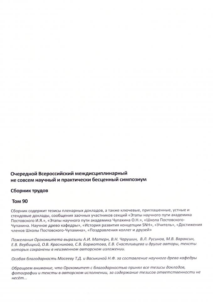 Роль дружеских химических связей в формировании научной школы : очередной Всероссийский междисциплинарный не совсем научный и практически бесценный симпозиум / Екатеринбург, 2024. - Т. 90 : Сборник трудов конференции по органической химии, посвященной 90-летию академика РАН Чупахина Олега Николаевича, 9 июня 2024 г., Екатеринбург. - 176 c.