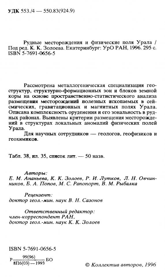 Рудные месторождения и физические поля Урала / Е. М. Ананьева, К. К. Золоев, Р. И. Лутков [и др.] ; ответственный редактор К. К. Золоев ; Российская академия наук, Уральское отделение [и др.]. - Екатеринбург, 1996. - 296 с.