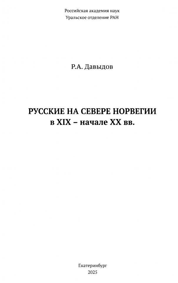Давыдов Р. А. Русские на севере Норвегии в XIX - начале XX вв. / Р. А. Давыдов ; Российская академия наук, Уральское отделение. - Екатеринбург, 2025. - 259 с.