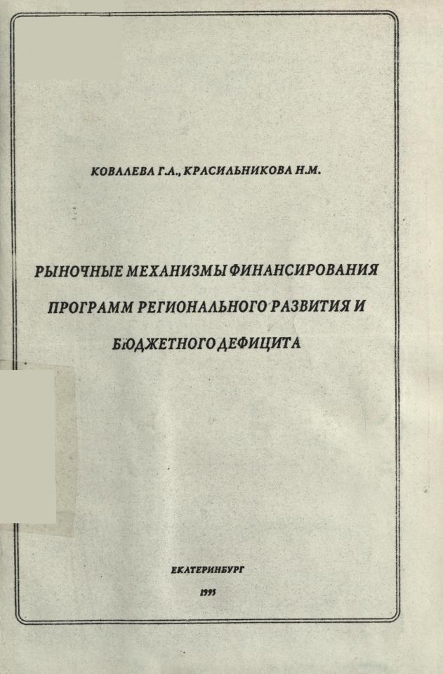 Ковалева Г. А. Рыночные механизмы финансирования программ регионального развития и бюджетного дефицита / Г. А. Ковалева, Н. М. Красильникова ; ответственный редактор А. В. Гайда ; ответственный за выпуск А. И. Никонова ; Российская академия наук, Уральское отделение, Институт философии и права. - Екатеринбург, 1995. - 118 с.