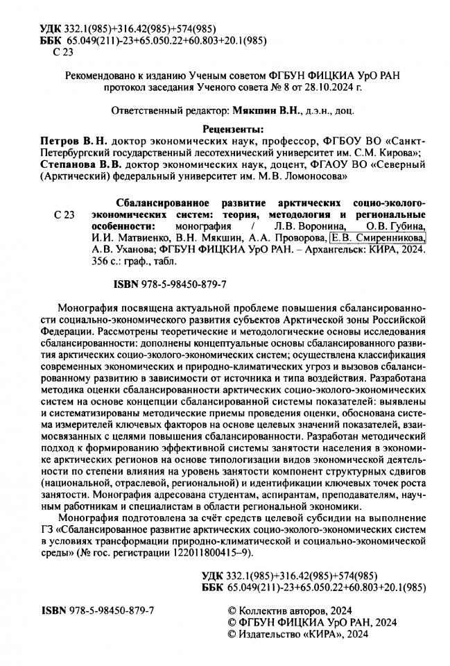 Сбалансированное развитие арктических социо-эколого-экономических систем: теория, методология и региональные особенности / Л. В. Воронина, О. В. Губина, И. И. Матвиенко [и др.] ; ответственный редактор В. Н. Мякшин ; Федеральный исследовательский центр комплексного изучения Арктики имени академика Н. П. Лаверова УрО РАН. - Архангельск : КИРА, 2024. - 345 с.