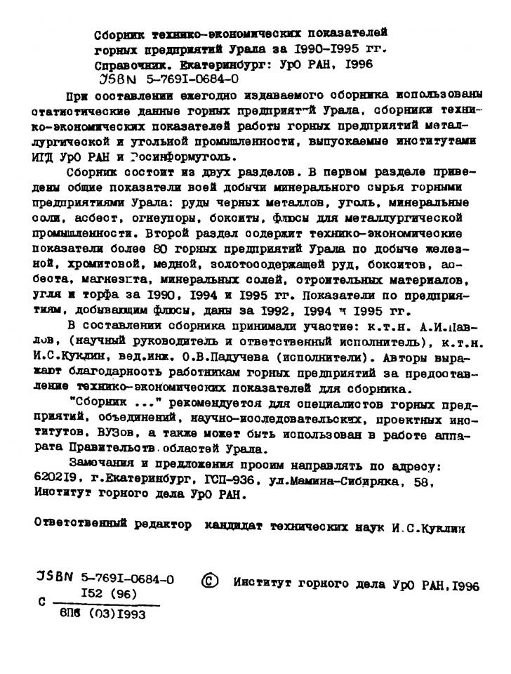 Сборник технико-экономических показателей горных предприятий Урала за 1990-1995 гг. / Российская академия наук, Уральское отделение, Институт горного дела ; ответственный редактор И. С. Куклин. - Екатеринбург, 1996. - 273 с.