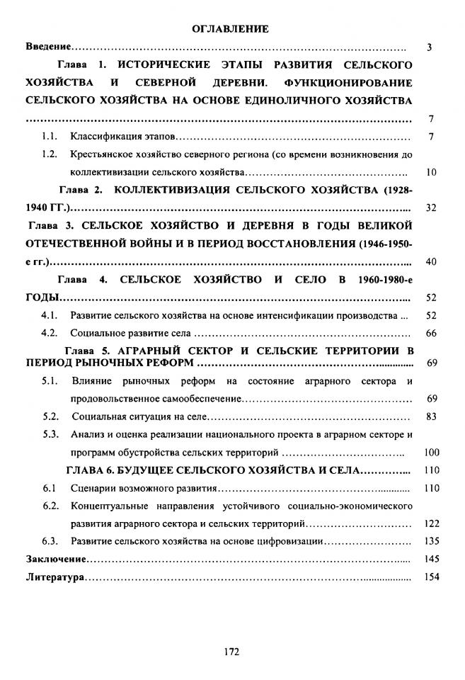 The monograph highlights the historical stages of the development of agriculture and rural areas in Komi. The evolution of the development of the peasant economy is investigated. The socio-economic processes during the collectivization of agriculture, the production of agricultural products and the development of local industry during the harsh trials of the Great Patriotic War and post-war reconstruction are considered. The analysis of the development of the agricultural sector and social transformations in rural areas in the 1960s and 1990s is given. The influence of the capitalist mode of production on the socio-economic development of northern agriculture and rural areas is estimated. The problems are identified, the prospects and directions of sustainable development of the agricultural sector and rural areas are substantiated.