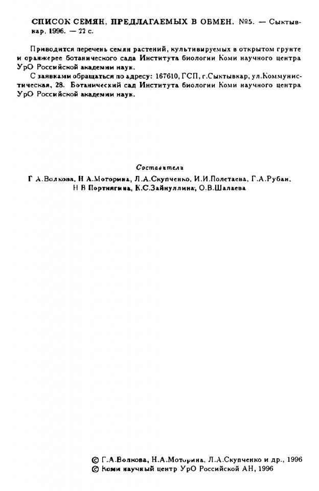 Список семян, предлагаемых в обмен = Delectus Seminum Quae pro Commutatione Offert / Российская академия наук, Уральское отделение, Коми научный центр, Институт биологии ; составители: В. П. Мишуров [и др.]. - Сыктывкар, 1996. - № 5. - 22 с.