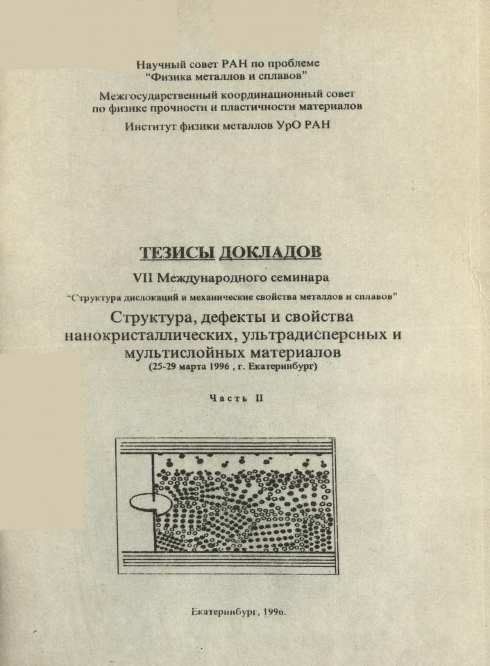 Стадийность рекристаллизации сверхмелкозернистых структур с ГДК решеткой по результатам измерений вибропоглощения / С. Б. Михайлов, Р. Р. Мулюков, Н. А. Михайлова, Д. А. Салимоненко // Структура, дефекты и свойства нанокристаллических, ультрадисперсионных и мультислойных материалов : тезисы докладов VII Международного семинара "Структура дислокаций и механические свойства металлов и сплавов" (25-29 марта 1996, г. Екатеринбург). - Екатеринбург, 1996. - Ч. II. - С. 145-146.