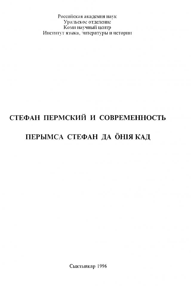 Стефан Пермский и современность = Перымса Стефан да öнiя кад / Российская академия наук, Уральское отделение, Коми научный центр, Институт языка, литературы и истории ; редколлегия: Г. Г. Бараксанов (отв. редактор) [и др.]. - Сыктывкар, 1996. - 108 с.