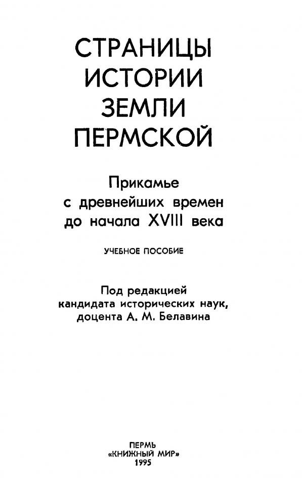 Страницы истории земли Пермской. Прикамье с древнейших времен до начала XVIII века : учебное пособие / Н. Н. Агафонова, А. М. Белавин, Н. Б. Крыласова ; под общей редакцией: А. М. Белавина. - Пермь : Книжный мир, 1995. - 224 с.