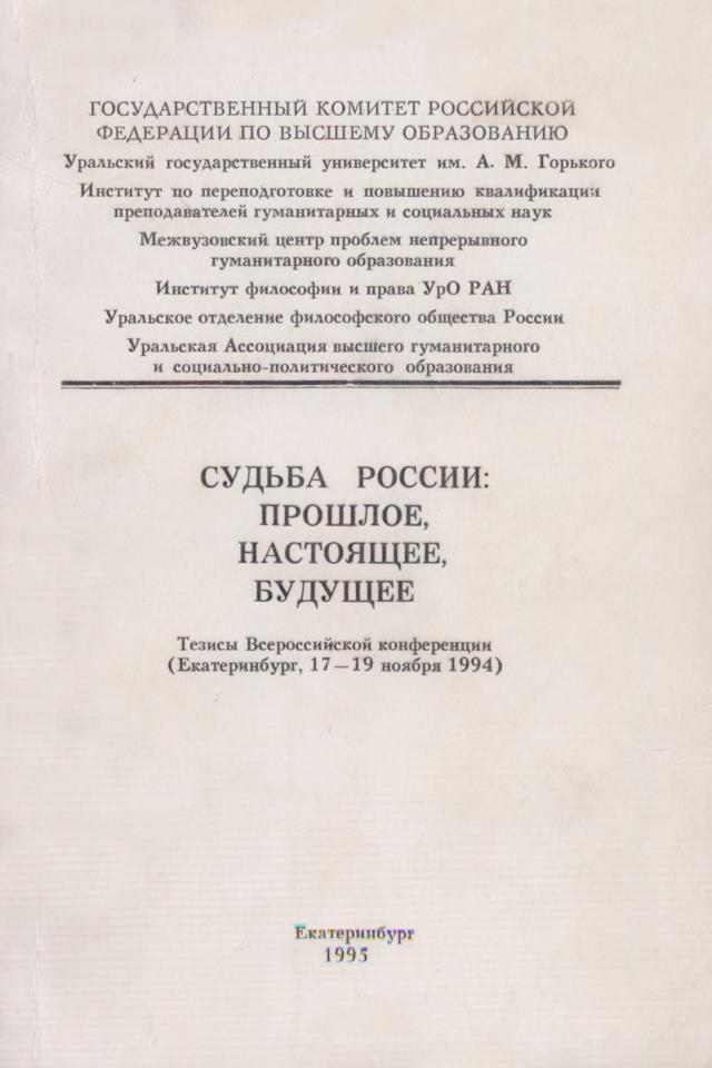 Судьба России: прошлое, настоящее, будущее : тезисы Всероссийской конференции, (Екатеринбург, 17-19 ноября 1994 г.) / Институт философии и права УрО РАН [и др.] ; редакционная коллегия: Копалов В. И. (отв. редактор) [и др.]. - Екатеринбург, 1995. - 313 с.