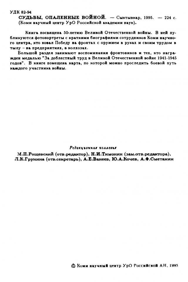 Судьбы, опаленные войной: ветераны Коми научного центра УрО Российской АН в Великой Отечественной войне / Российская академия наук, Уральское отделение, Коми научный центр ; редакционная коллегия: М. П. Рощевский (ответственный редактор) [и др.]. - Сыктывкар, 1995. - 223 с. : фот., карты.