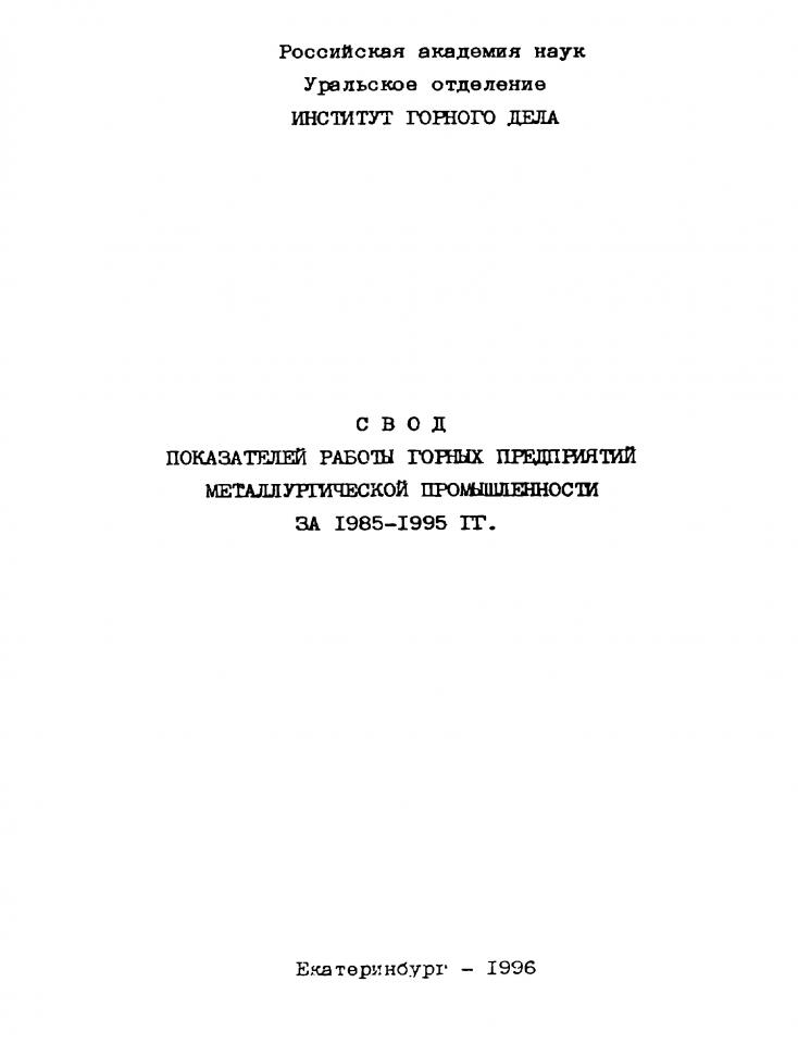 Свод показателей работы горных предприятий металлургической промышленности за 1985-1995 гг. / Российская академия наук, Уральское отделение, Институт горного дела ; ответственный редактор А. И. Павлов. - Екатеринбург, 1996. - 275 с.