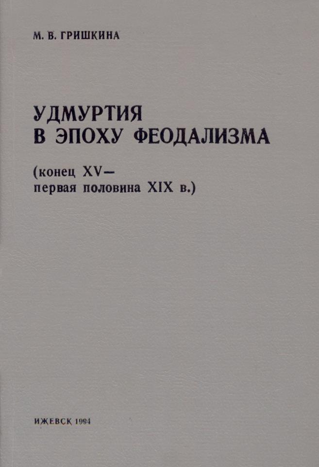 Гришкина М. В. Удмуртия в эпоху феодализма (конце XV-первая половина XIX в.) : монография / М. В. Гришкина ; Российская академия наук, Уральское отделение, Удмуртский институт истории, языка и литературы. - Ижевск, 1994. - 207 с. - (Материалы к истории Удмуртии ; вып. 2).