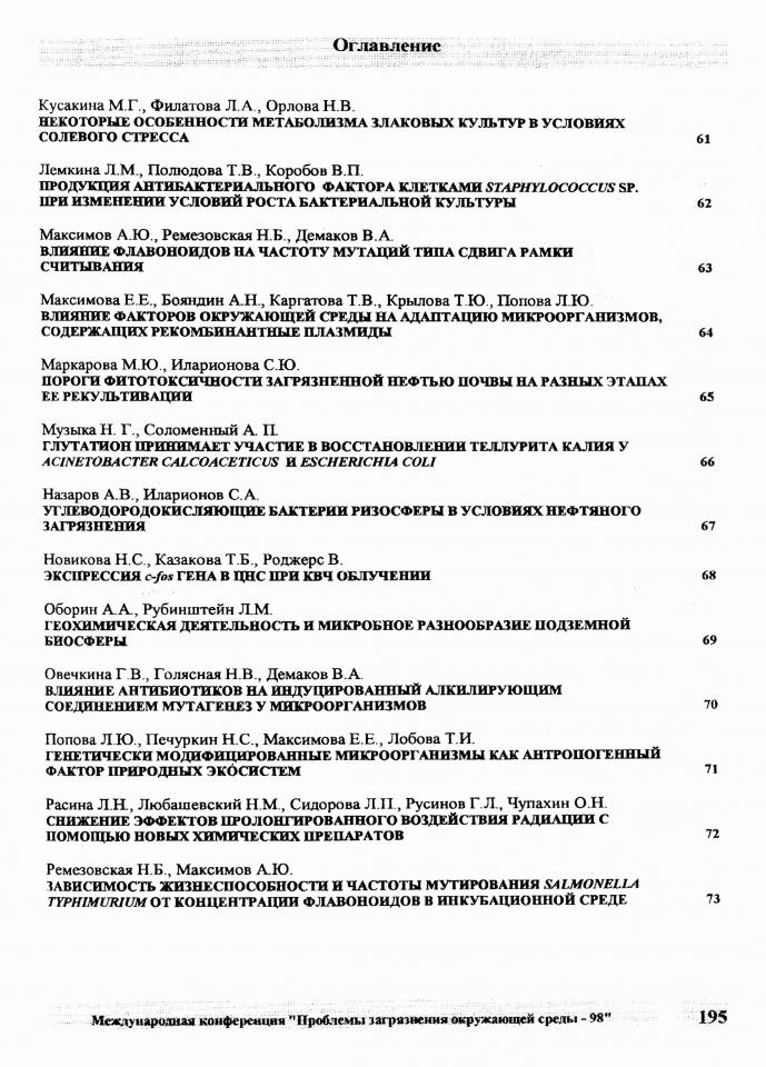 Максимов А. Ю. Влияние флавоноидов на частоту мутаций типа сдвига рамки считывания / А. Ю. Максимов, Н. Б. Ремезовская, В. А. Демаков // Международная конференция "Проблемы загрязнения окружающей среды-98", 12-18 сентября 1998 г., Москва, Россия = International Conference "Environmental Pollution ICEP`98". - Москва, Россия, 1998. - С. 63.
