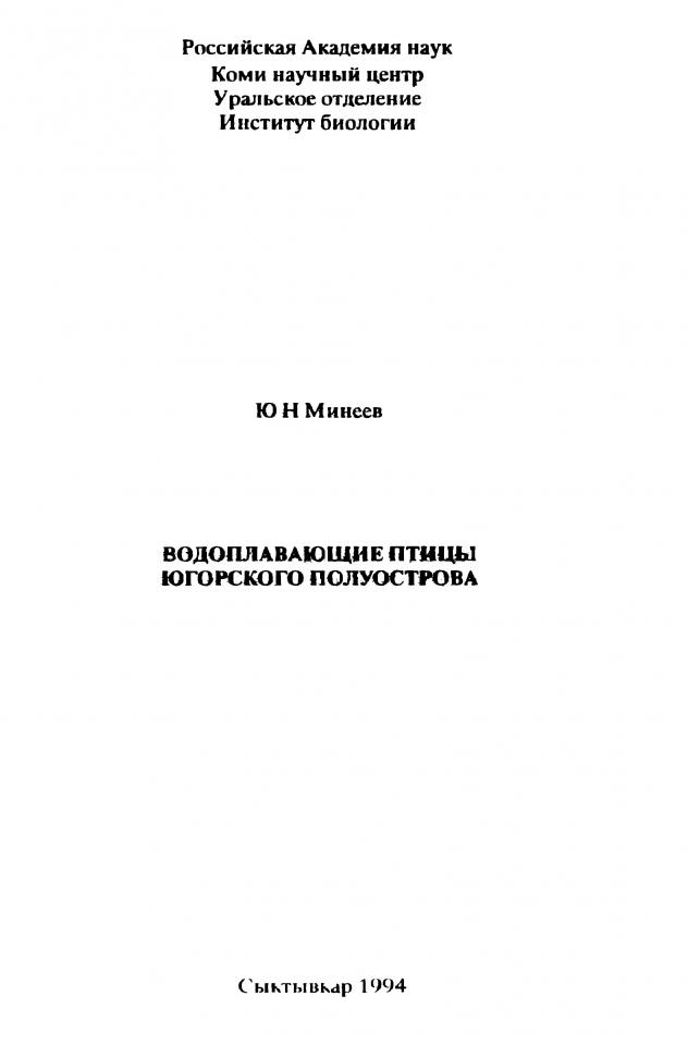 Минеев Ю. Н. Водоплавающие птицы Югорского полуострова / Ю. Н. Минеев ; ответственный редактор В. Г. Кривенко ; Российская академия наук, Коми научный центр, Уральское отделение, Коми научный центр, Институт биологии. - Сыктывкар, 1994. - 103 с.
