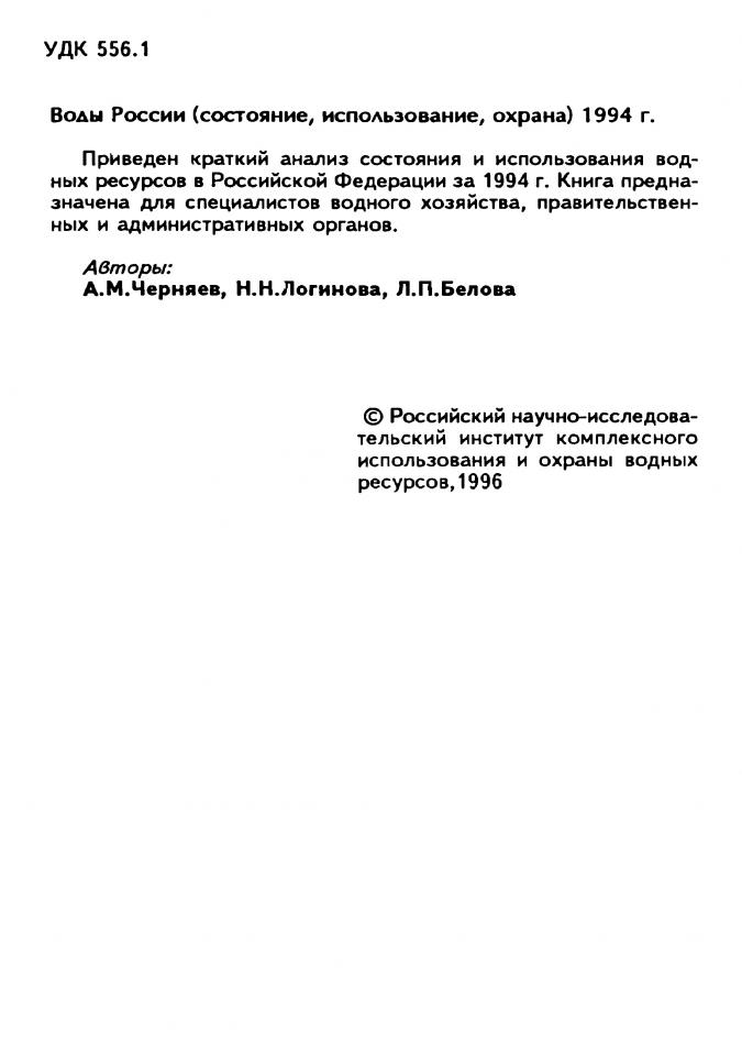 Черняев А. М. Воды России (состояние, использование, охрана). 1994 год : научное издание / А. М. Черняев, Н. Н. Логинова, Л. П. Белова ; Российская академия наук, Уральское отделение [и др.]. - Екатеринбург, 1996. - 87 с.