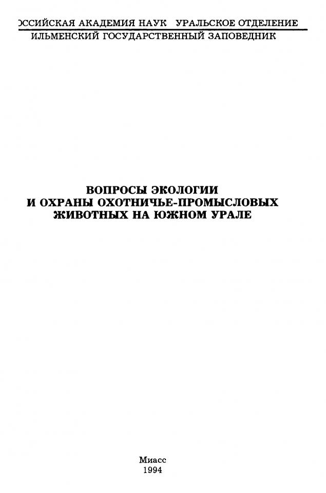 Вопросы экологии и охраны охотничье-промысловых животных на Южном Урале : сборник научных трудов / Российская академия наук, Уральское отделение, Ильменский государственный заповедник ; ответственный редактор В. Д. Захаров. - Миасс, 1994. - 64 с. - (Серия биологическая).