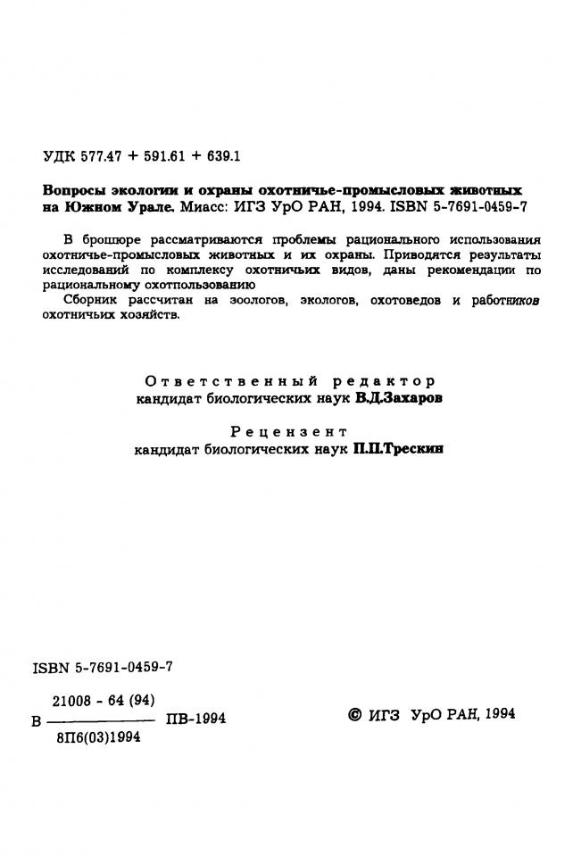 Вопросы экологии и охраны охотничье-промысловых животных на Южном Урале : сборник научных трудов / Российская академия наук, Уральское отделение, Ильменский государственный заповедник ; ответственный редактор В. Д. Захаров. - Миасс, 1994. - 64 с. - (Серия биологическая).