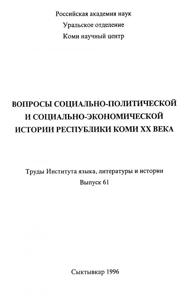 Вопросы социально-политической и социально-экономической истории республики Коми XX века / Российская академия наук, Уральское отделение, Коми научный центр ; редколлегия: А. Н. Турубанов (отв. редактор) [и др.]. - Сыктывкар, 1996. - 131 с. - (Труды Института языка, литературы и истории Коми научного центра УрО РАН ; вып. 61).