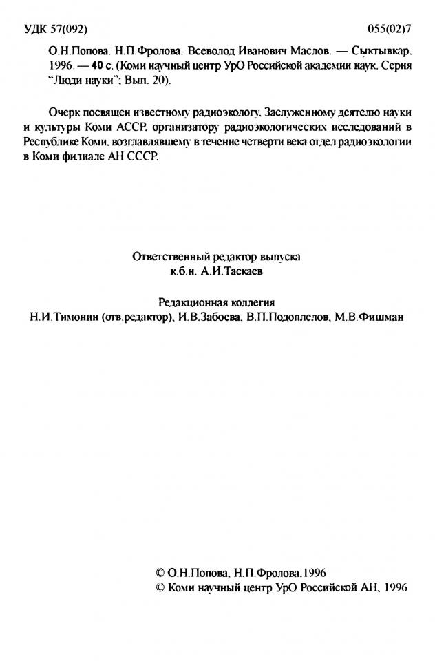 Попова О. Н. Всеволод Иванович Маслов (страницы биографии ученого-радиоэколога) / Российская академия наук, Уральское отделение, Коми научный центр ; О. Н. Попова, Н. П. Фролова ; ответственный редактор выпуска А. И. Таскаев ; ответственный редактор Н. И. Тимонин. - Сыктывкар, 1996. - 41 с. - (Серия “Люди науки” ; вып. 20).