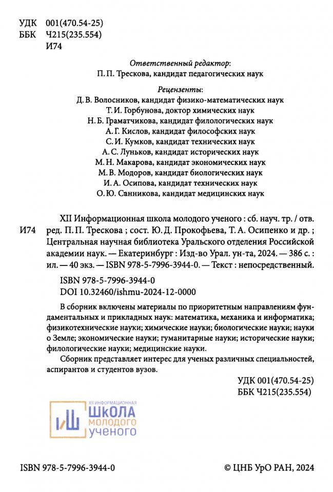 XII Информационная школа молодого ученого, Екатеринбург, 23-26 сентября 2024 г. : сборник научных трудов / Центральная научная библиотека Уральского отделения Российской академии наук ; ответственный редактор П. П. Трескова ; составители: Ю. Д. Прокофьева, Т. А. Осипенко [и др.]. - Екатеринбург : Издательство Уральского университета, 2024. - 383, [1] с.