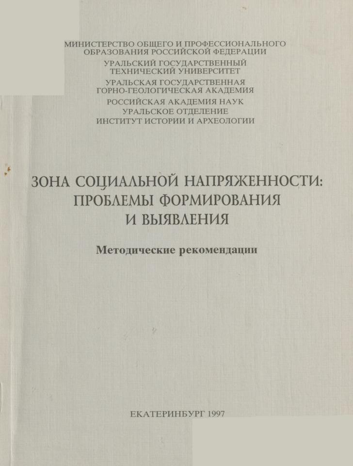 Зона социальной напряженности: проблемы формирования и выявления : методические рекомендации / Т. Д. Тургель, М. Н. Игнатьева, Ю. В. Абдурахимов, Л. Е. Стровский ; ответственный редактор Е. Т. Артемов ; Уральский государственный технический университет [и др.]. - Екатеринбург, 1997. - 30 с.