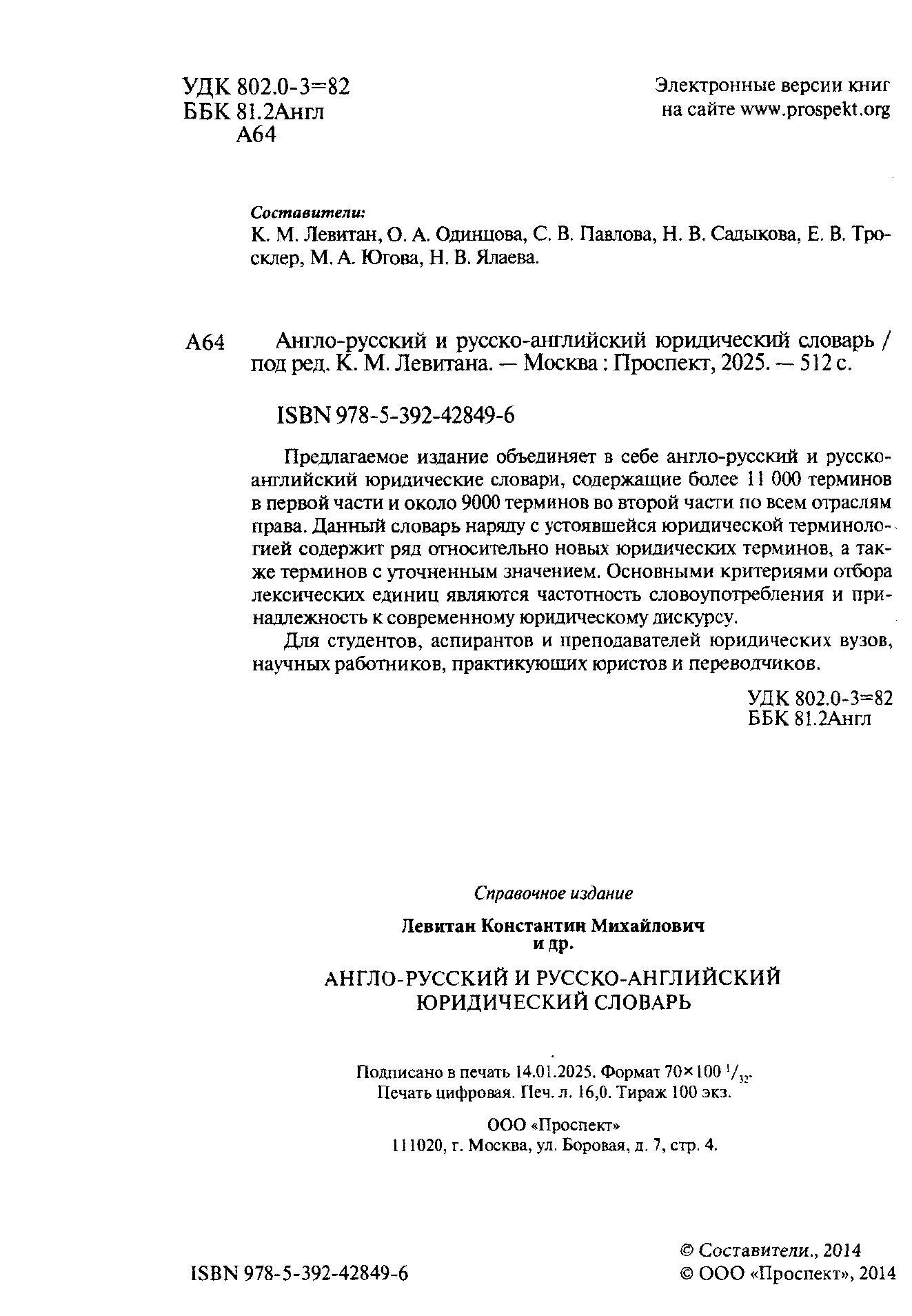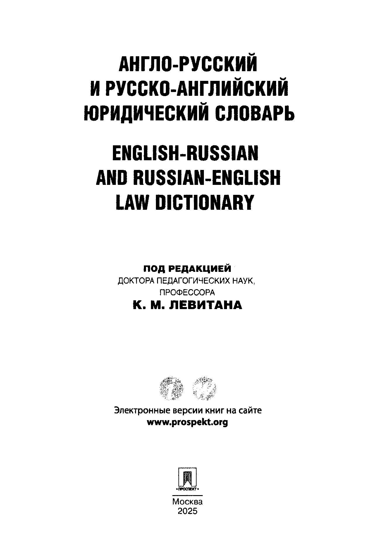 Англо-русский и русско-английский юридический словарь.-М.:Проспект,2025. / П/р Левитана К.М.. - Б. м. : Проспект, 2025. - 512 с. - ISBN 978-5-392-42849-6