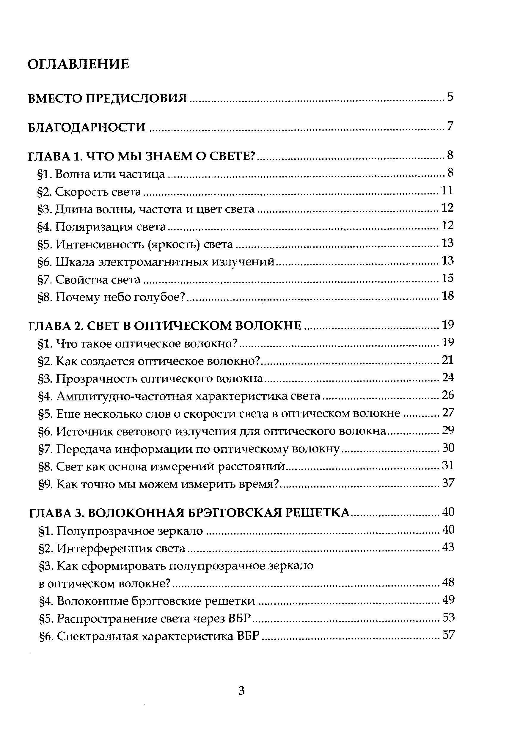 Приведен обзор методов и средств измерений температуры, деформации, давления, вибрации и оптических свойств прозрачных веществ и материалов, выполняемых при помощи датчиков, сформированных в сердцевине оптических волокон. Изложены основные понятия о свете, дается определение характеристикам светового излучения, таким как длина волны, частота, поляризация, интенсивность, описаны принципы распространения света в оптических волокнах, рассмотрены вопросы передачи информации по волокну, даны подходы к определению расстояний. Дается определение и принцип распространения света в периодических неоднородных оптических структурах, в частности в волоконных решетках Брэгга. Рассмотрены подходы к измерению температуры, деформации, давления и вибраций при помощи волоконных брэгговских решеток. Изложены подходы к определению свойств жидкостей и газов при помощи оптических измерений. Для широкого круга читателей, интересующихся физикой света.
