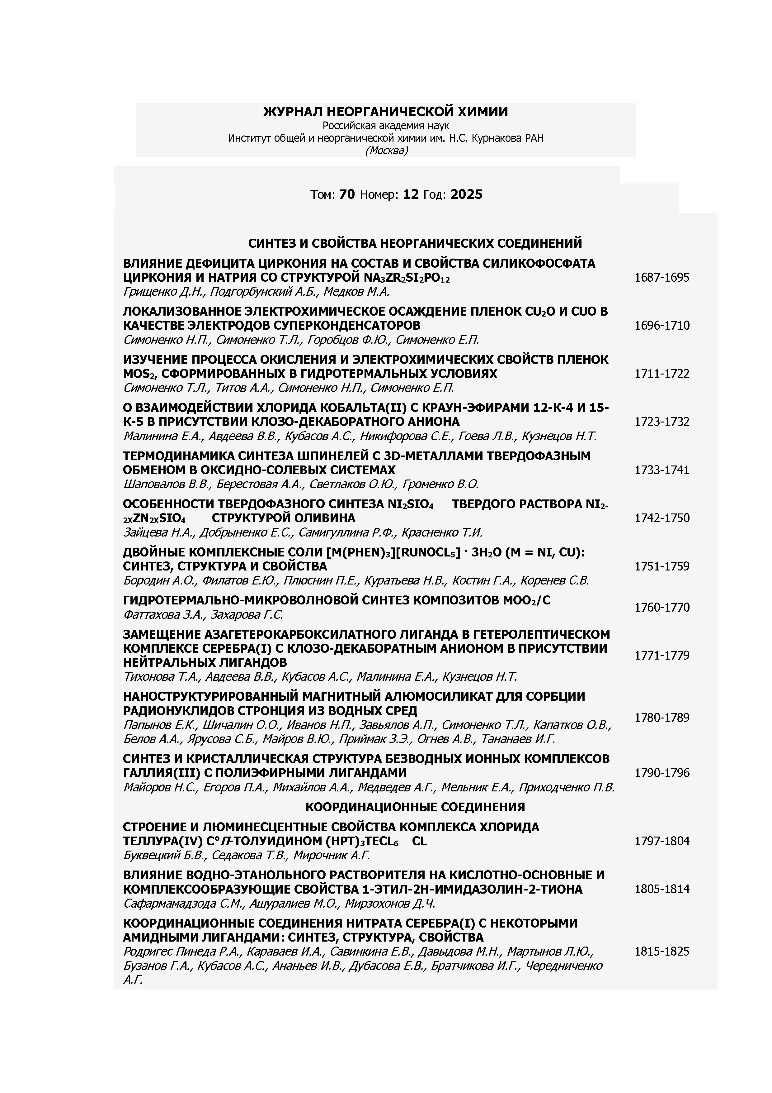 Журнал неорганической химии 2025 Т.70 №12