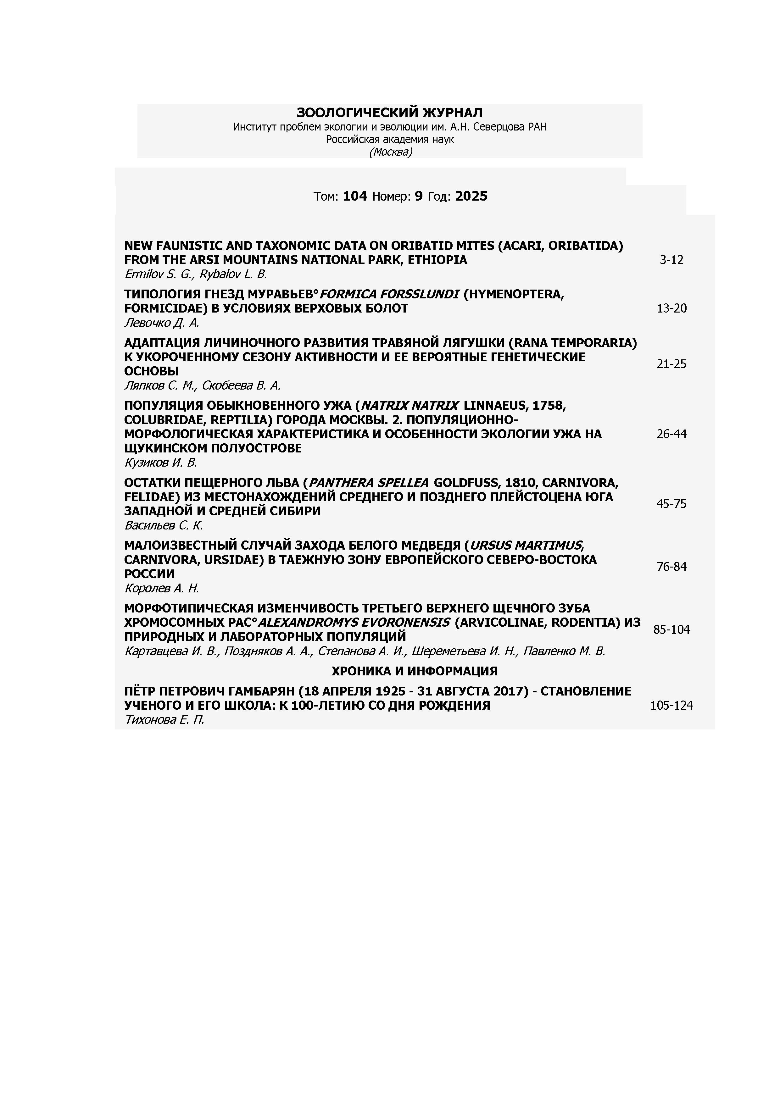 Зоологический журнал 2025 Т.104 N 9 |