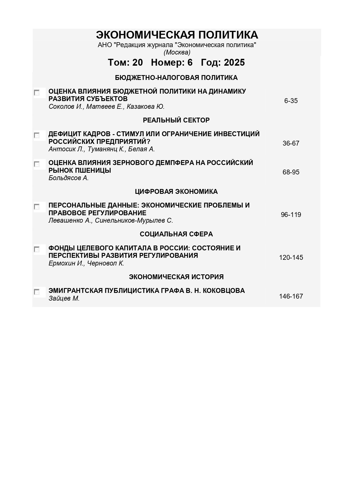 12.03.2026-17:30 Экономическая политика 2025 Т.20 № 6 Экономическая политика 2025 Т.20 № 6 2025 6