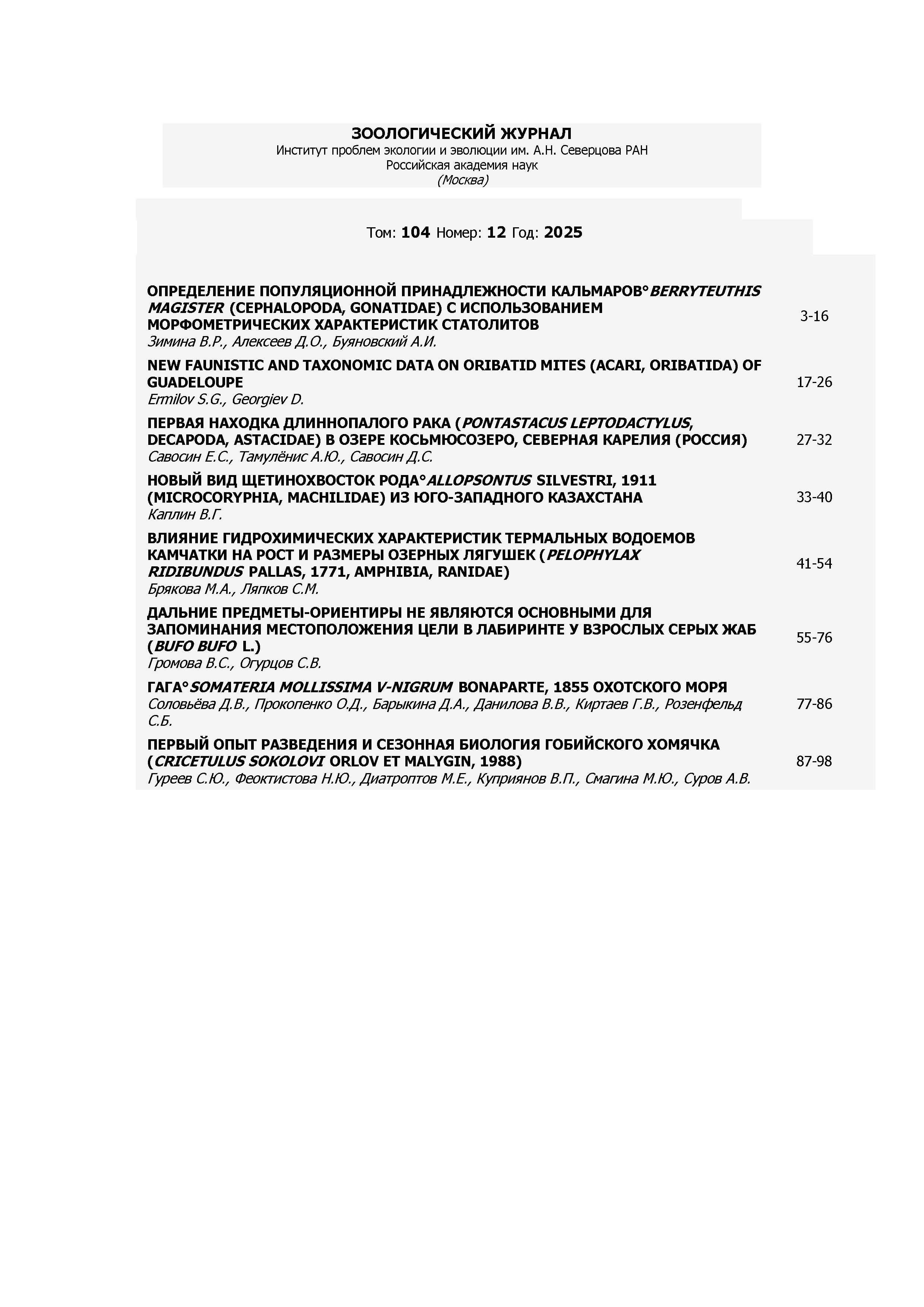 Зоологический журнал 2025 Т.104 N12 | Зоологический журнал 2025 Т.104 N12 | 2025 | 12 |