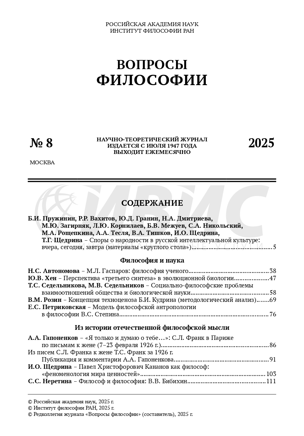 Вопросы философии 2025 № 8 | Вопросы философии 2025 № 8 | 2025 | 8 |