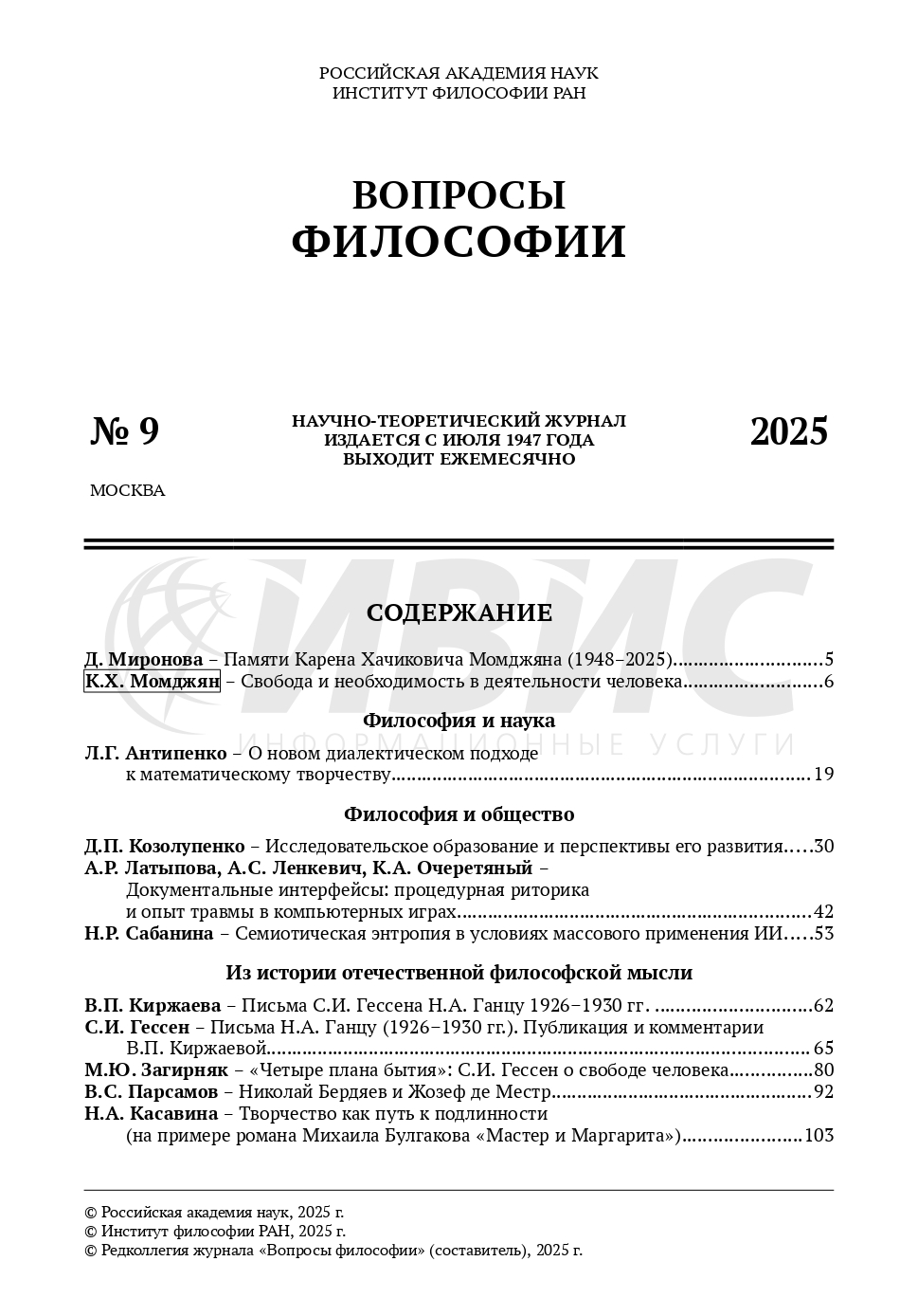 Вопросы философии 2025 № 9 | Вопросы философии 2025 № 9 | 2025 | 9 |