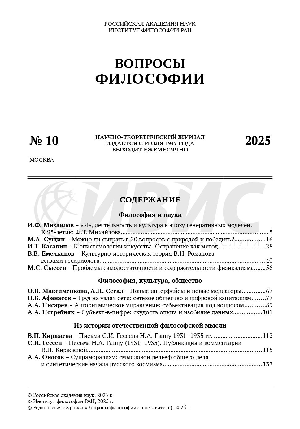 Вопросы философии 2025 №10 | Вопросы философии 2025 №10 | 2025 | 10 |
