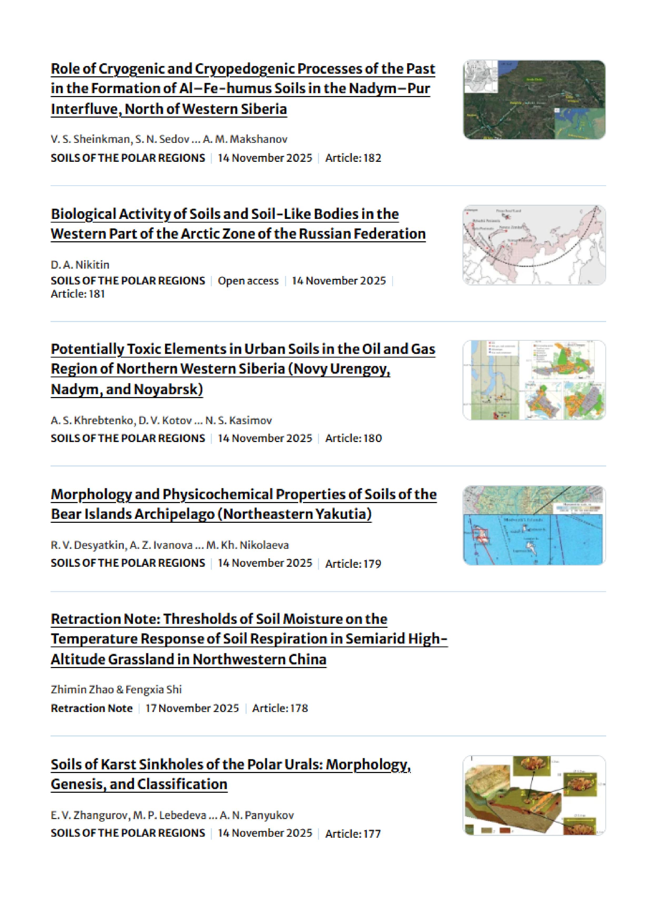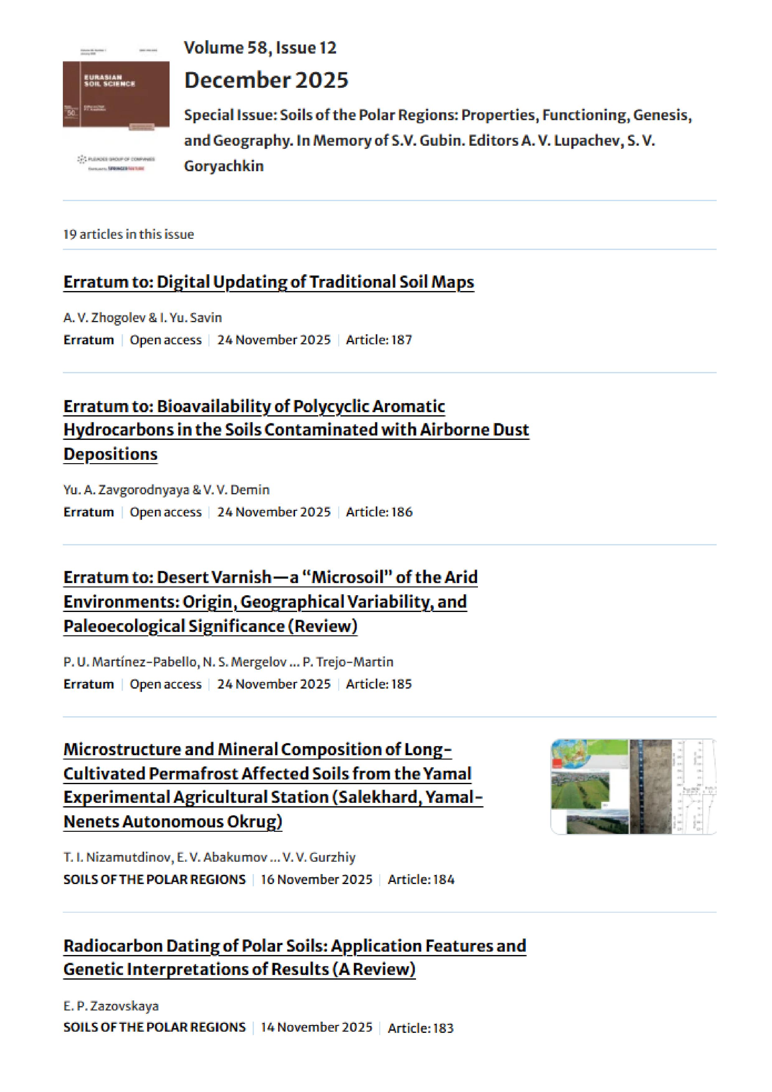 Eurasian Soil Science 2025 Vol. 58 Is.12 : Special Issue "Soils of the Polar Regions: Properties, Functioning, Genesis, and Geography. In Memory of S.V. Gubin. Editors A. V. Lupachev, S. V. Goryachkin" |