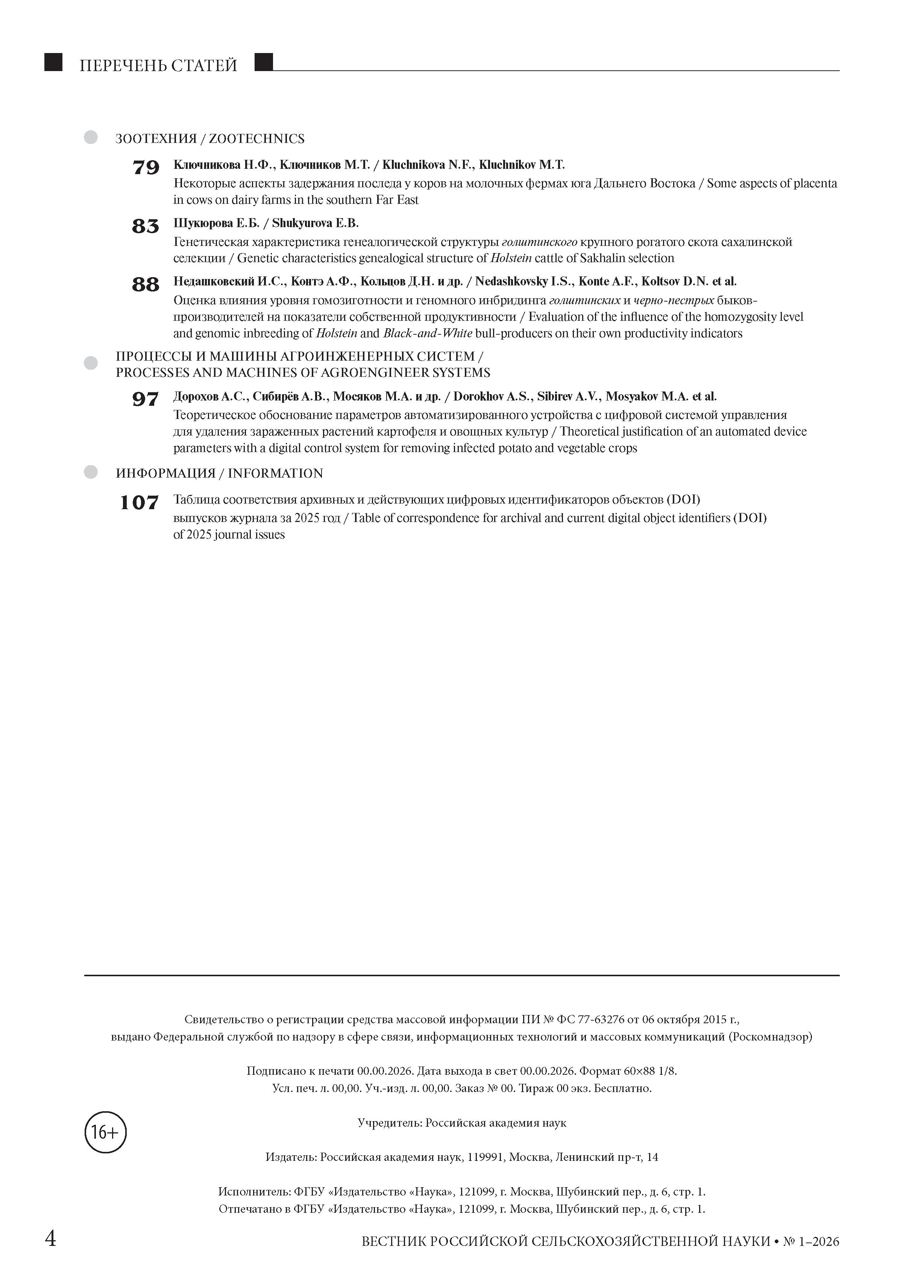 Вестник Российской сельскохозяйственной науки 2026 № 1 |