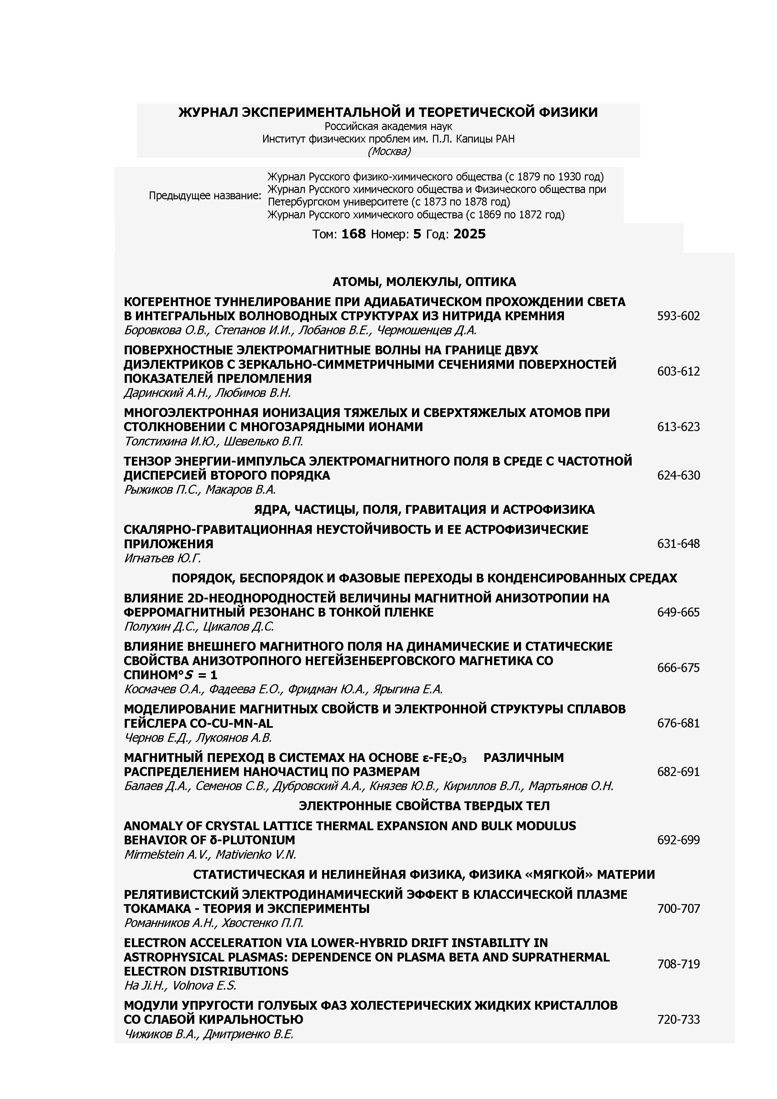 25.11.2025-15:54 Журнал экспериментальной и теоретической физики 2025 Т.168 N 5 Журнал экспериментальной и теоретической физики 2025 Т.168 N 5 2025 11