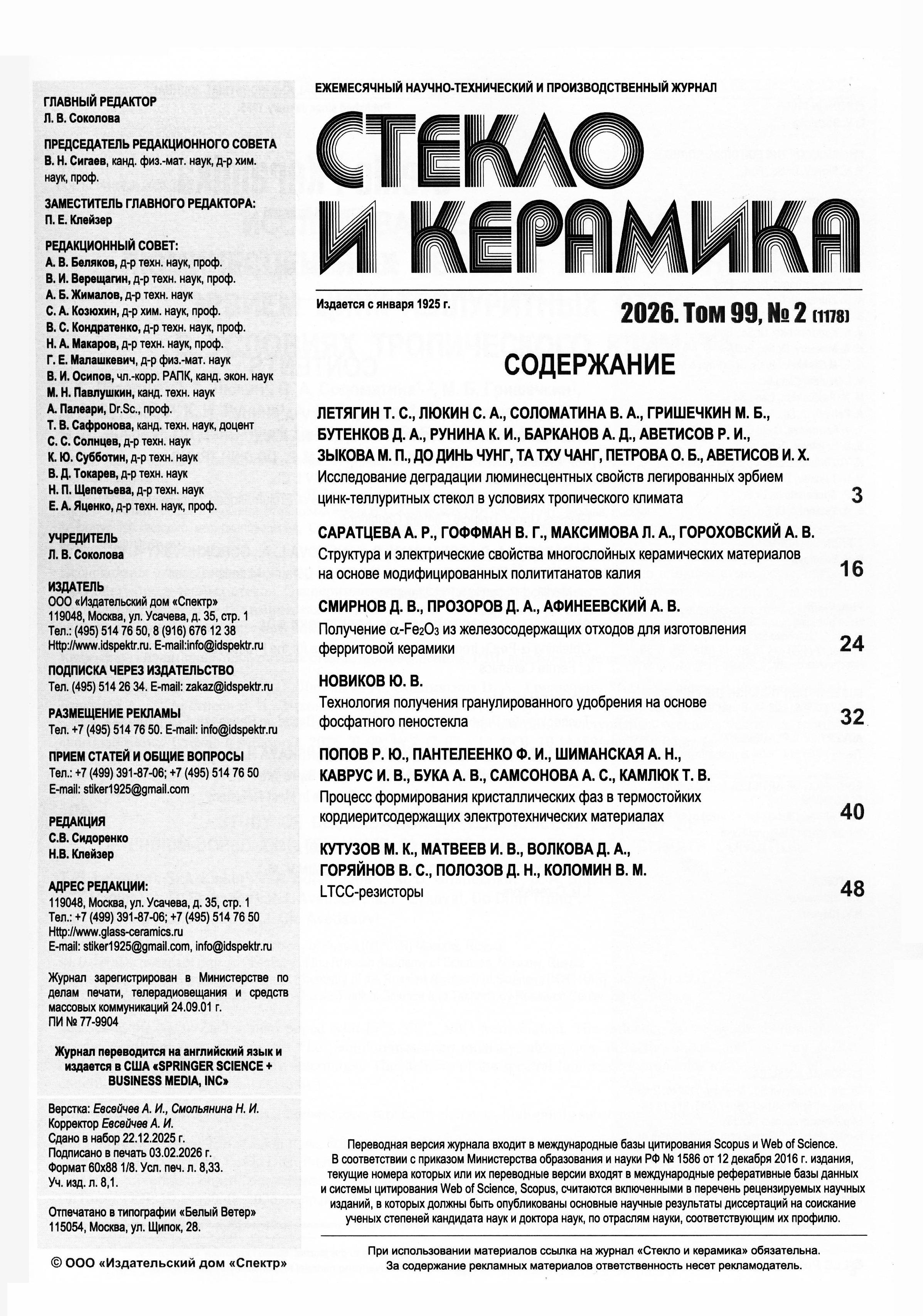 Стекло и керамика 2026 Т. 99 № 2 |