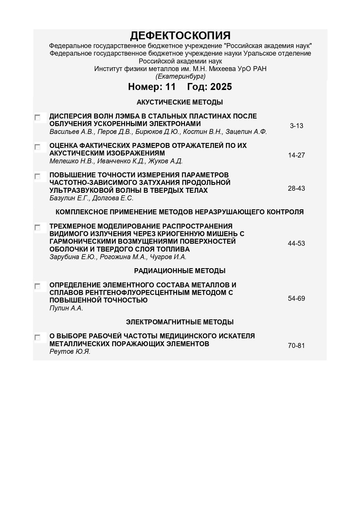 Дефектоскопия 2025 №11 | Дефектоскопия 2025 №11 | 2025 | 11 |