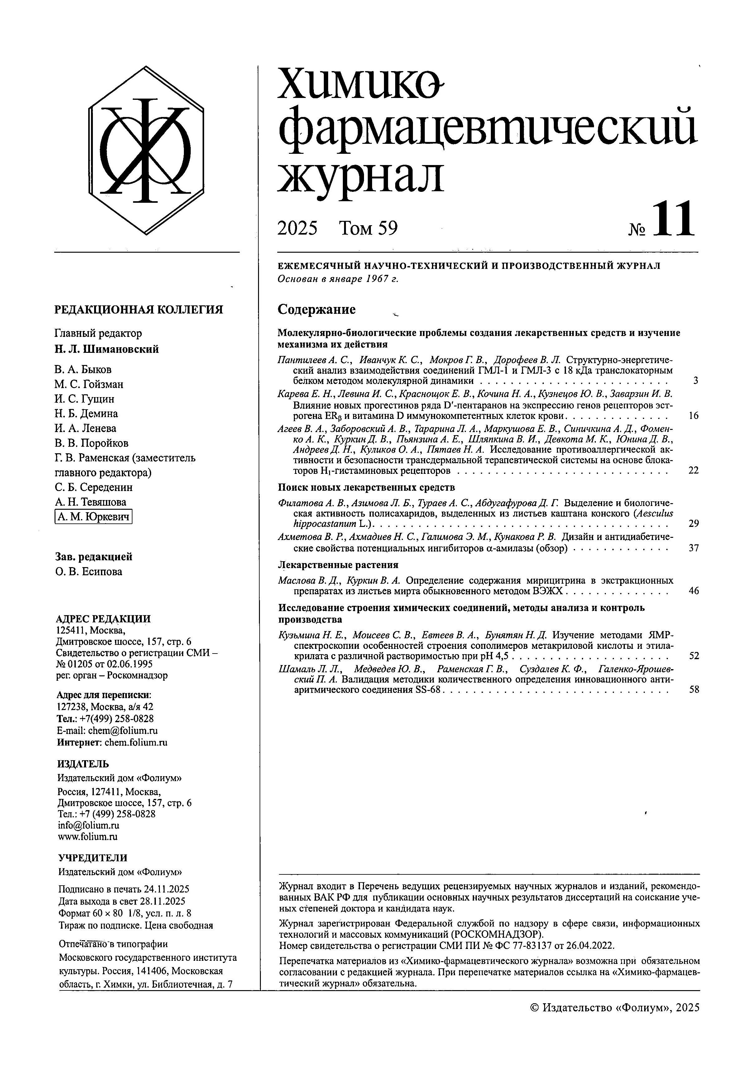 Химико-фармацевтический журнал 2025 Т. 59 № 11 | Химико-фармацевтический журнал 2025 Т. 59 № 11 | 2025 | 11 |
