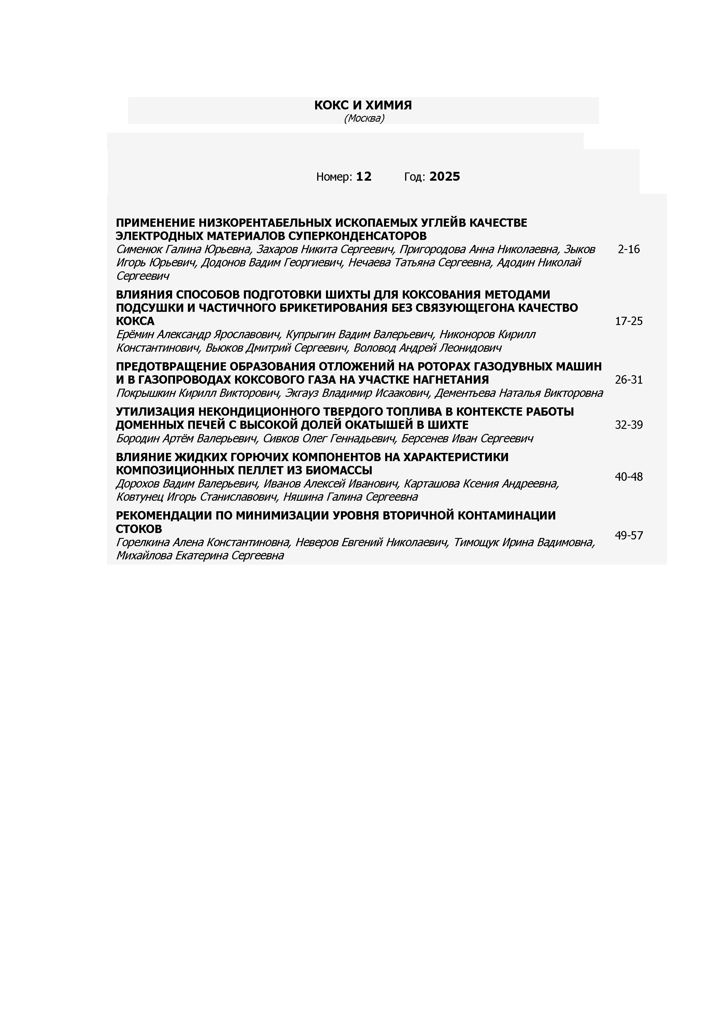 Кокс и химия 2025 №12 | Кокс и химия 2025 №12 | 2025 | 12 |