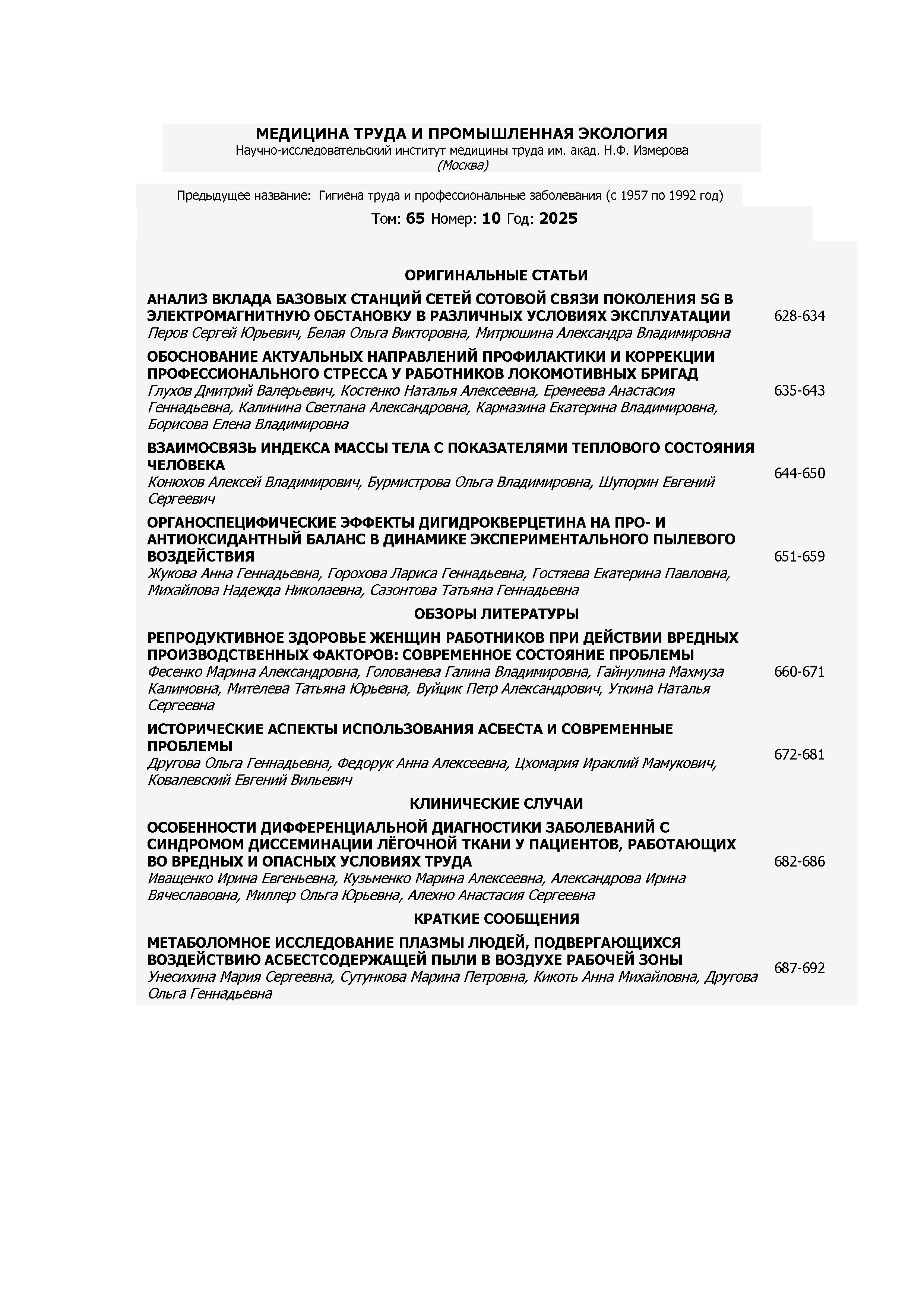 Медицина труда и промышленная экология 2025 Т.65 N10 |