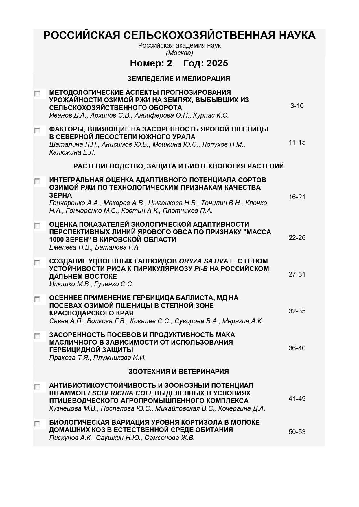 Российская сельскохозяйственная наука 2025 № 2 |