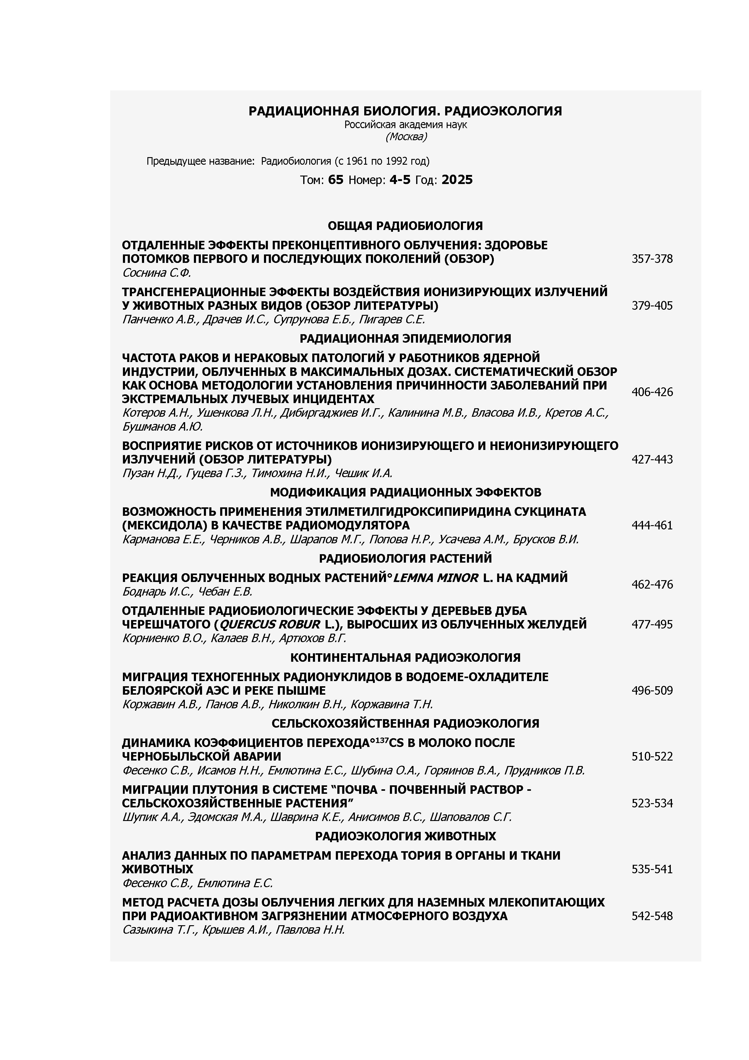 Радиационная биология. Радиоэкология 2025 Т. 65 N 4-5 |