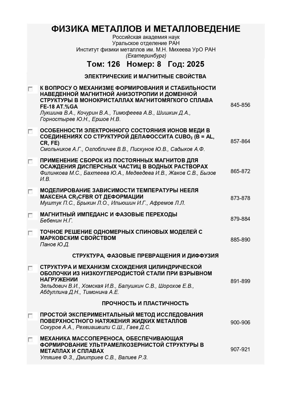 Физика металлов и металловедение 2025 Т.126 № 8 |