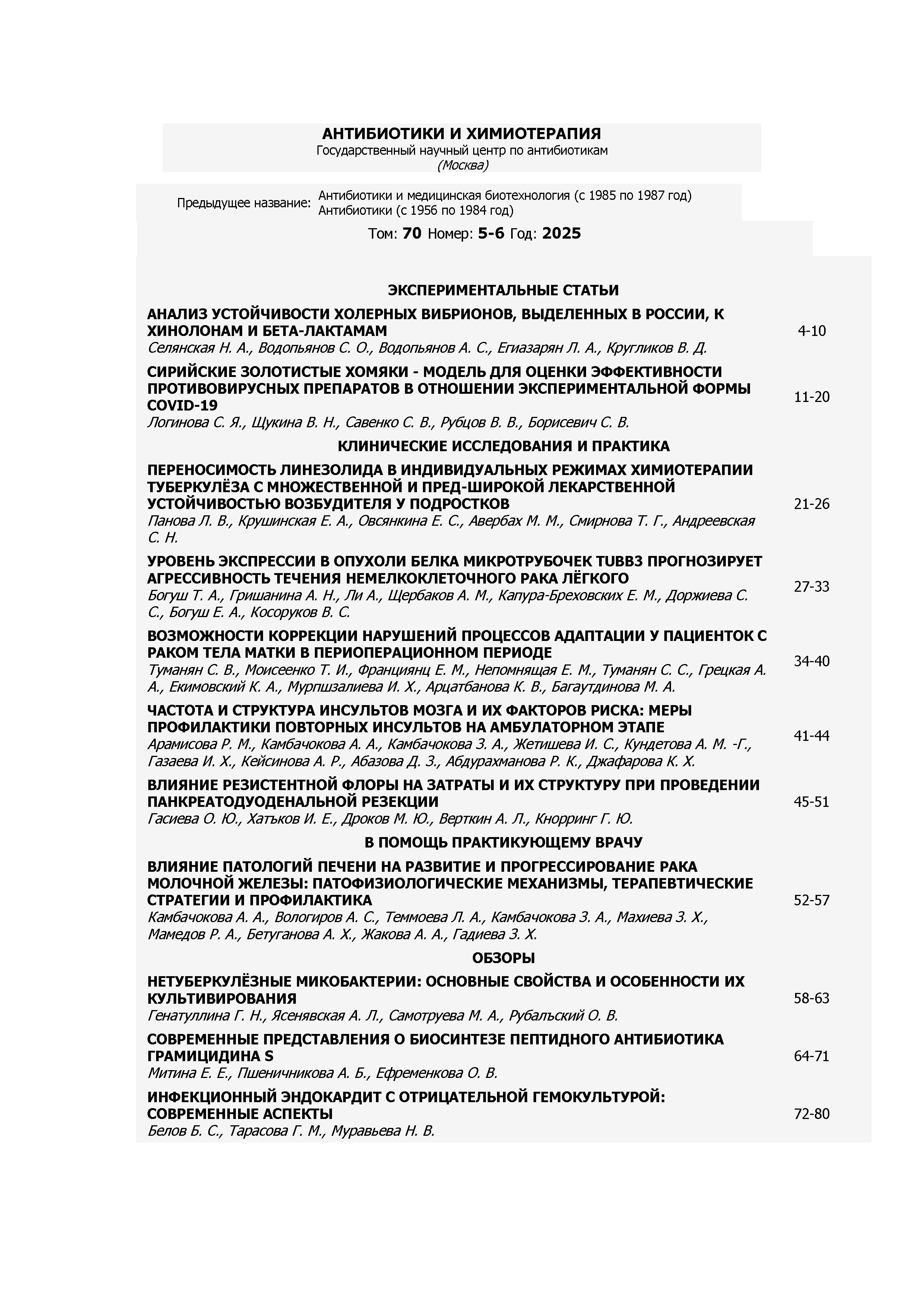 Антибиотики и химиотерапия 2025 Т. 70 N 5-6 | Антибиотики и химиотерапия 2025 Т. 70 N 5-6 | 2025 | 3 |
