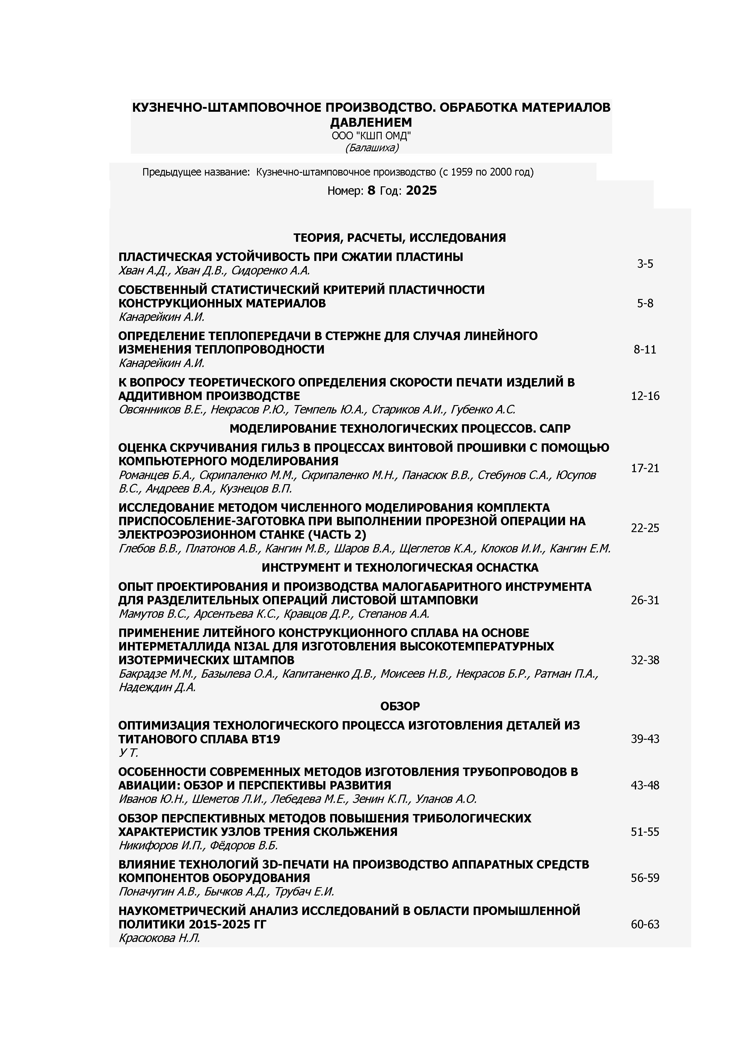 Кузнечно-штамповочное производство. Обработка материалов давлением 2025 N 8 |