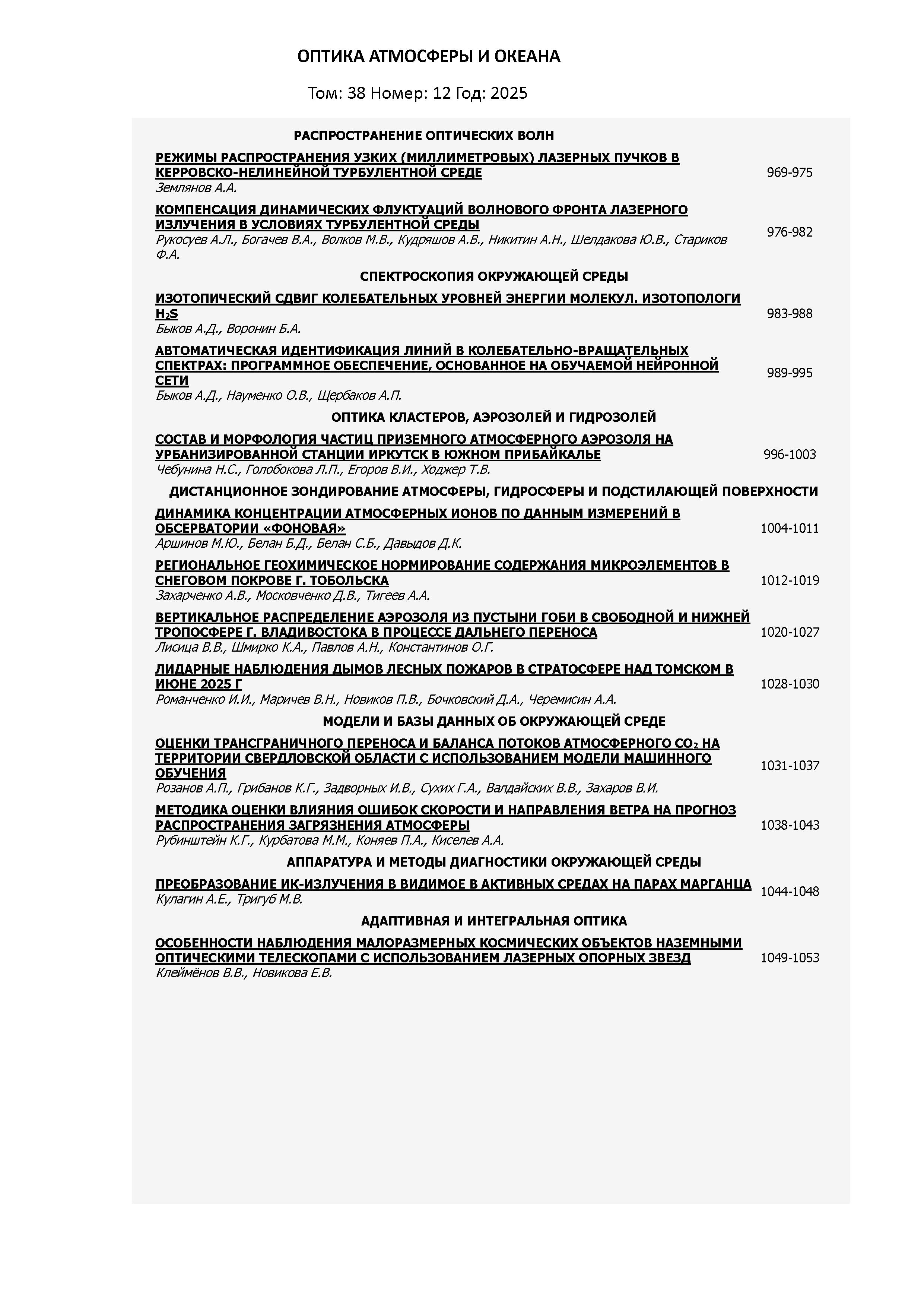 Оптика атмосферы и океана 2025 Т. 38 N 12 | Оптика атмосферы и океана 2025 Т. 38 N 12 | 2025 | 12 |