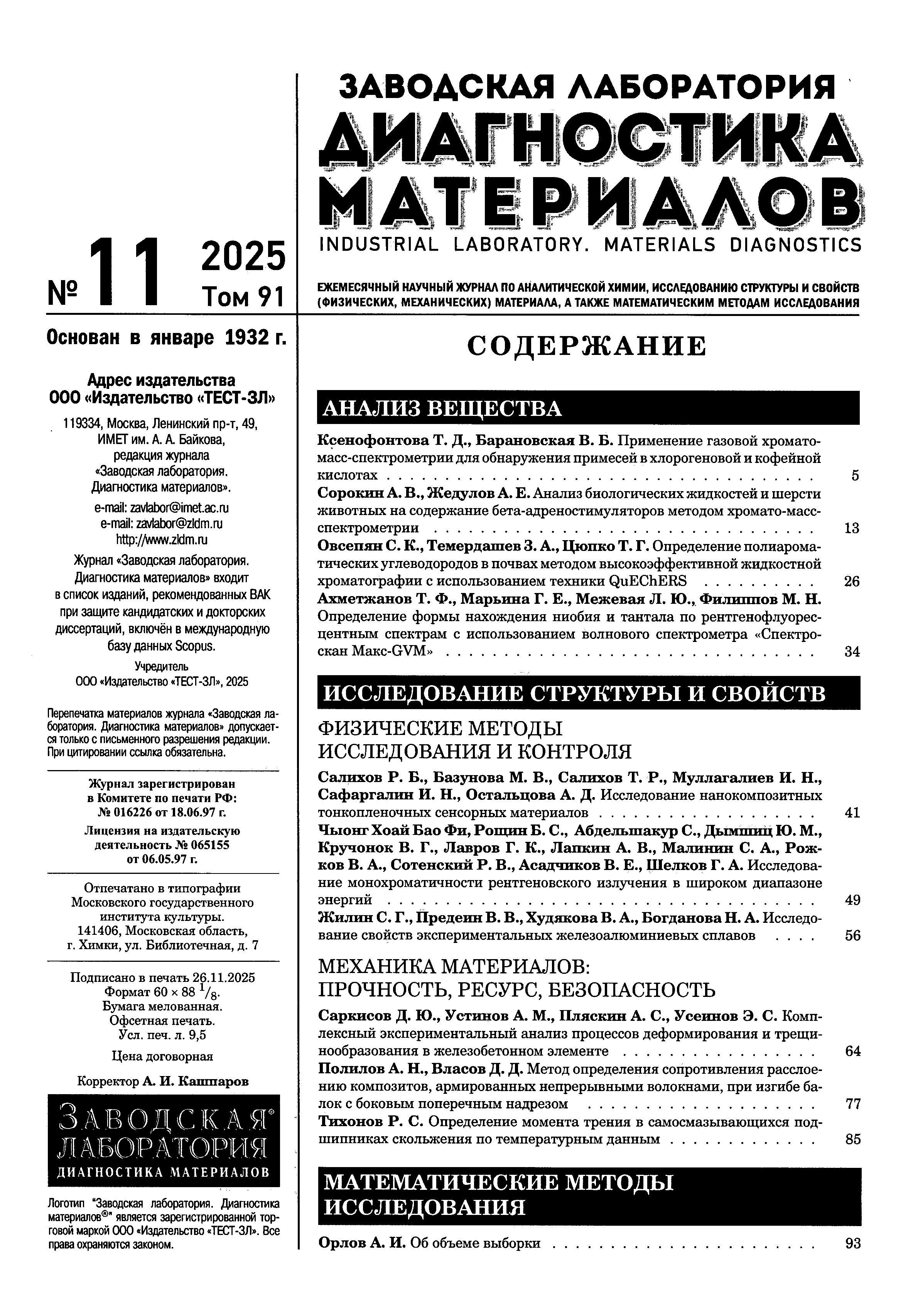 Заводская лаборатория. Диагностика материалов 2025 Т.91 № 11 | Заводская лаборатория. Диагностика материалов 2025 Т.91 № 11 | 2025 | 11 |